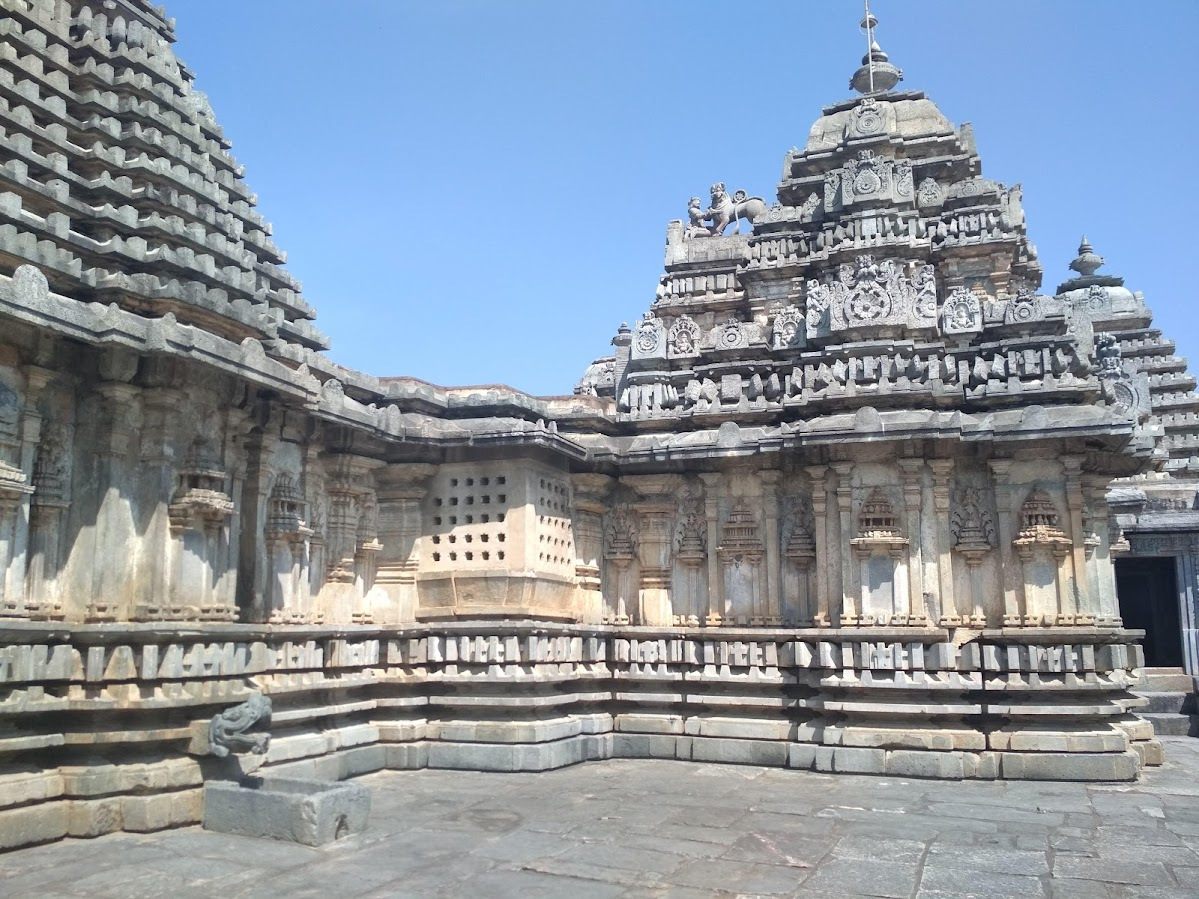 Most of these sites are located near Belur which was the first destination of our trip. While on the way to Belur from Hassan, the province capital, we stopped at the Doddagadduvalli. The town is home to temples from the Chalukya era with Laxmi mandir with 4 Garbhagruha (sanctums). The Dwarpals of Laxmi or Durga feature two Vetals with some truly amazing hairstyles (including breaded hair). The other three Garbhagrihas are dedicated to Shiva, Vishnu, and Parvati. Forming a quadrilateral of brother-sister (Shiva-Laxmi and Vishnu-Parvati) and husband-wife(Shiva-Parvati and Vishnu-Laxmi) relationships. This temple has historical importance and was once considered the second most important place of worship in the Chalukya Empire after the Laxmi Temple at Kolhapur.